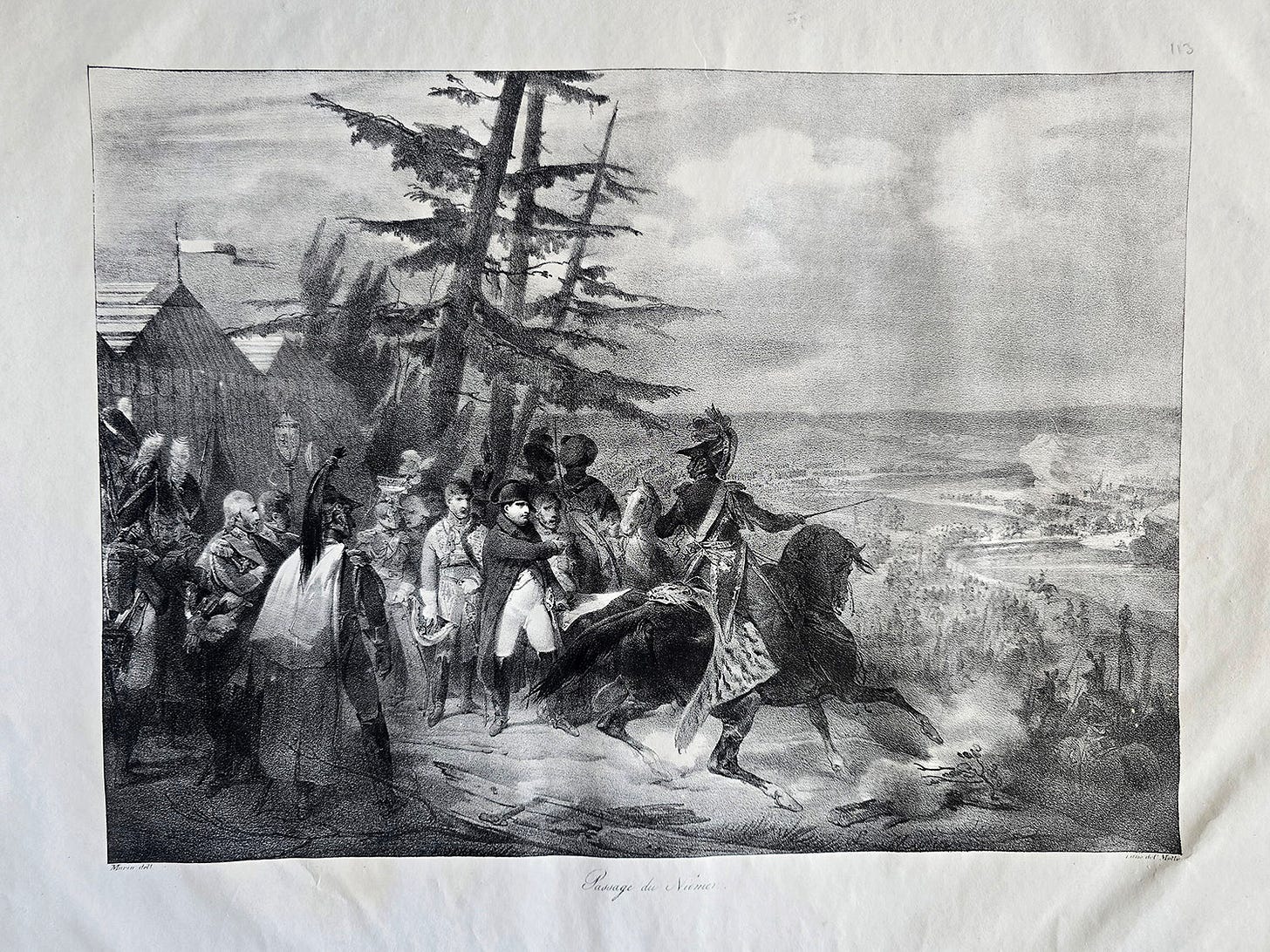 Passage du Niemen, the label at the bottom reads. It shows Napoleon at the very beginning of his infamous march toward Moscow -- the moment his army crosses the Neman (Nemunas) River.